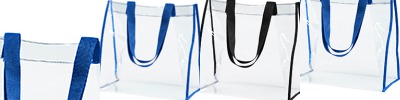 100% PVC; double zipper pull made with 600d material; transparent tote bag made with double-polished; 6" gusset; 29.5” carrying handles; stadium compliant; 12” x 12 ”x 6”;