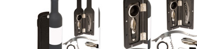 - Bottle-shaped case includes stainless steel waiter's key-style corkscrew, drip ring, and pourer with stopper